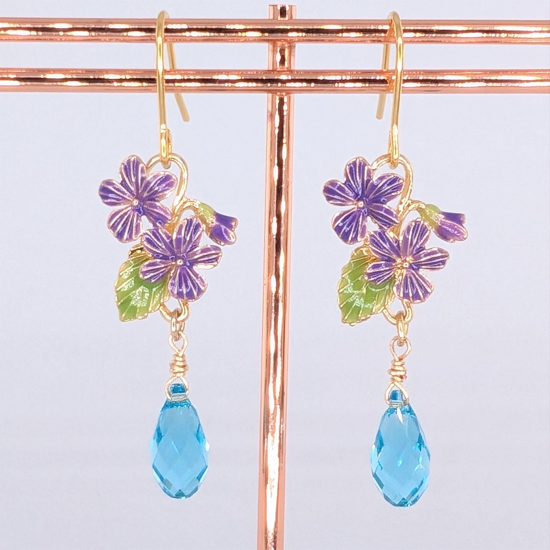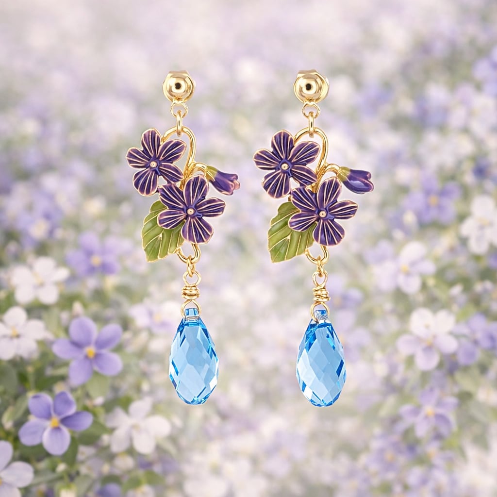 紫の花びらと柔らかなグリーンの葉が耳元を華やかに彩り、透明感のあるブルーの雫がゆらめきます。