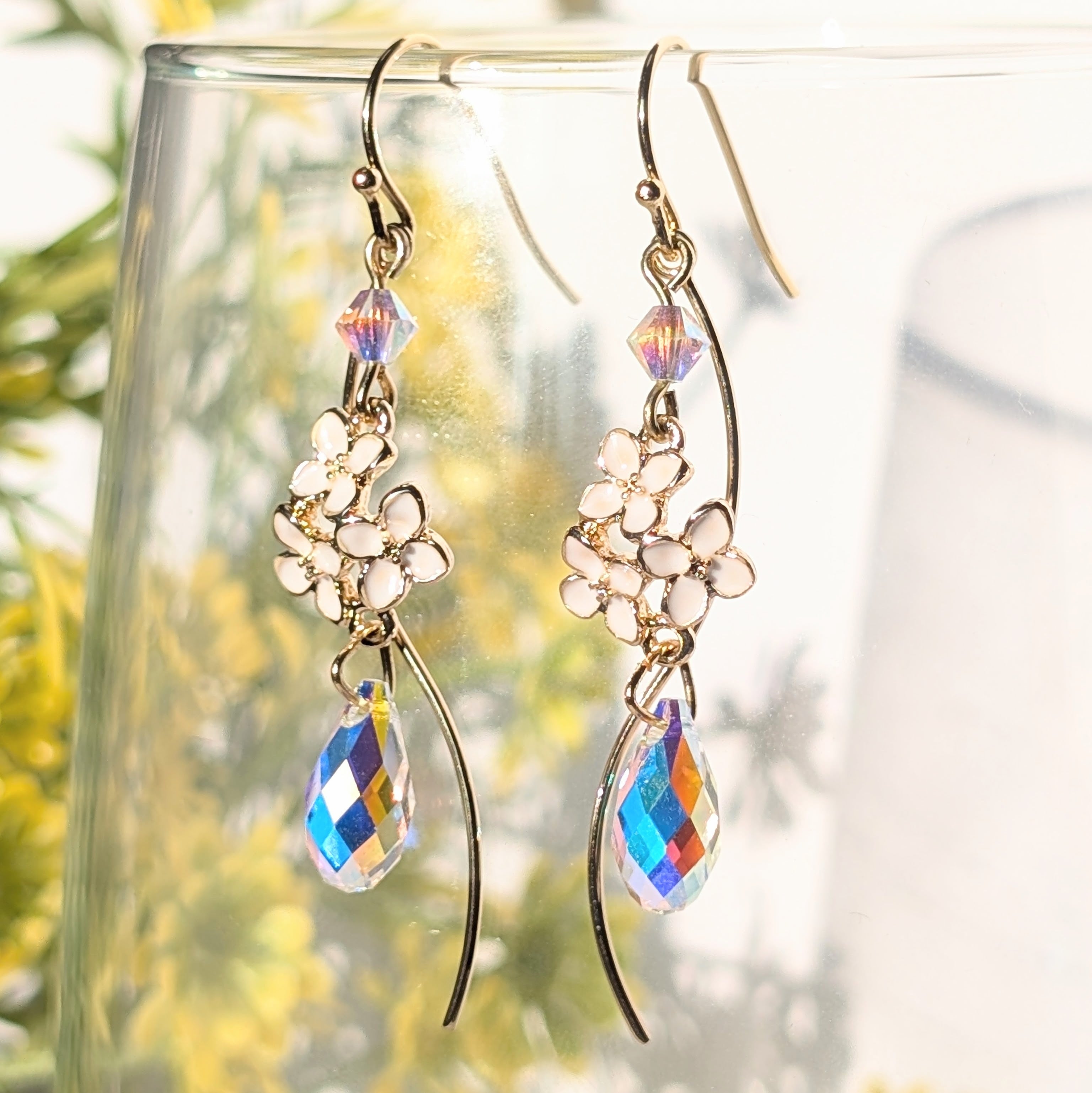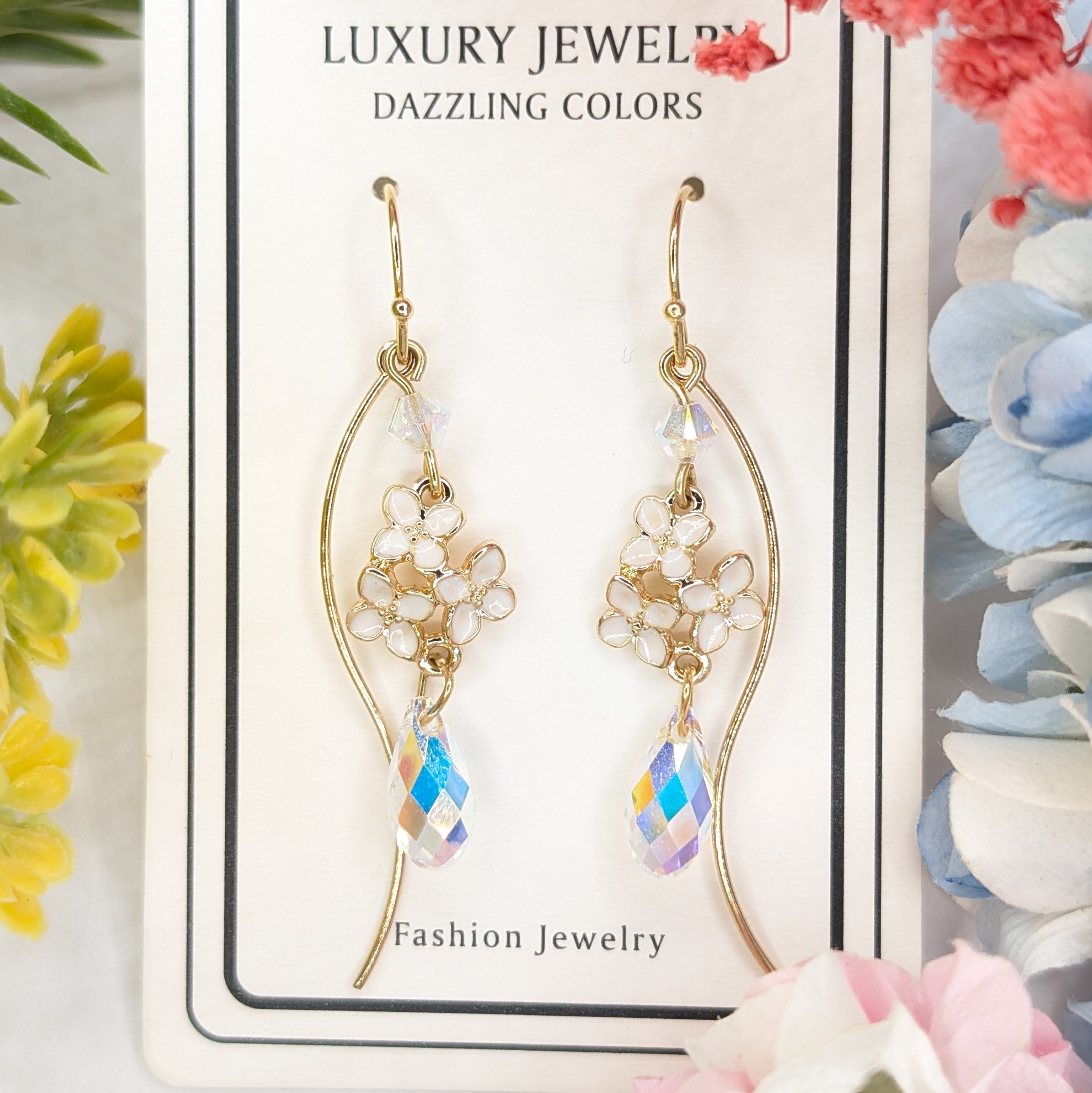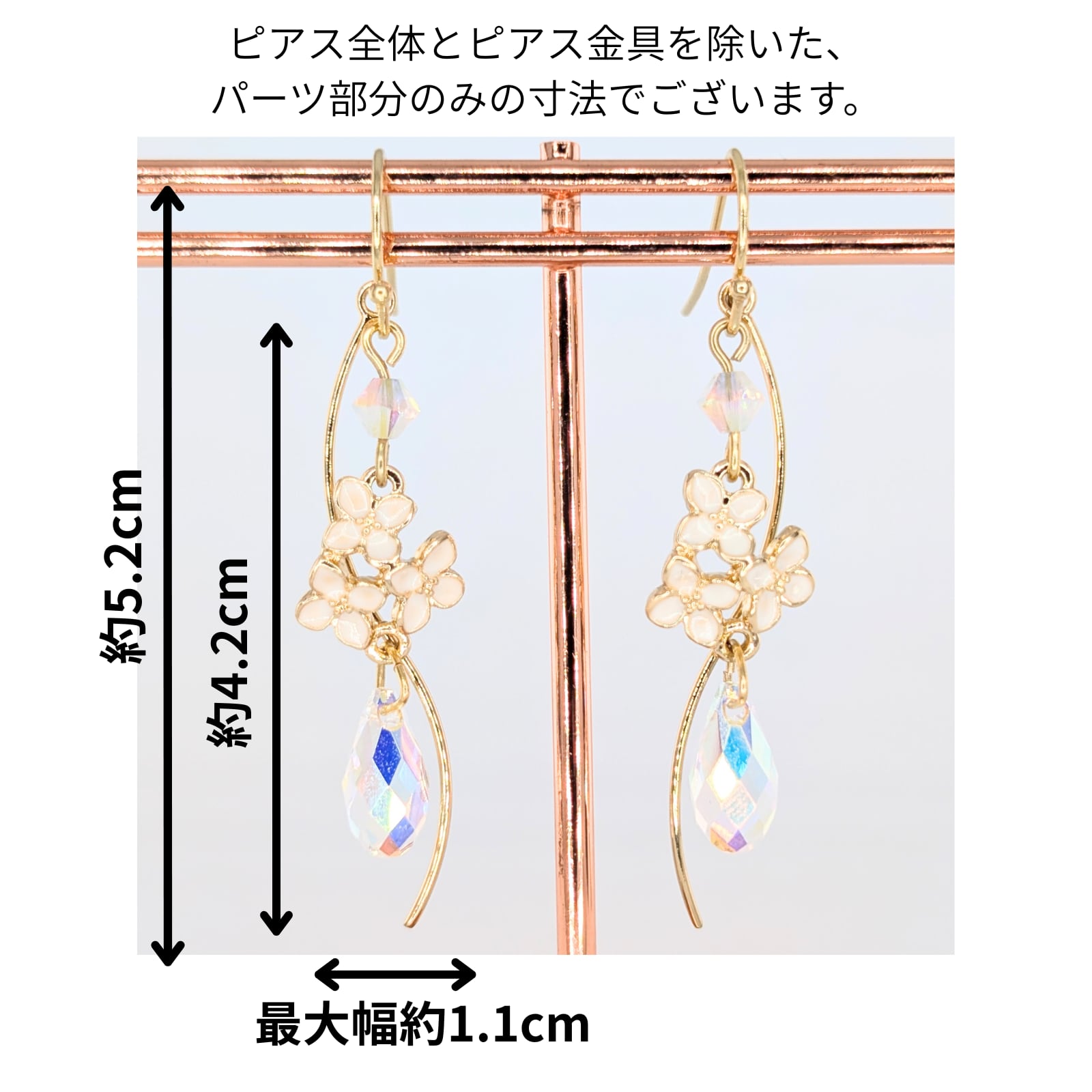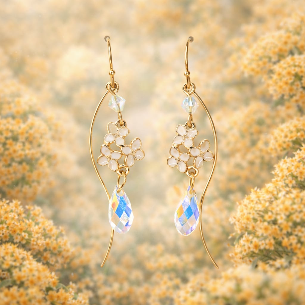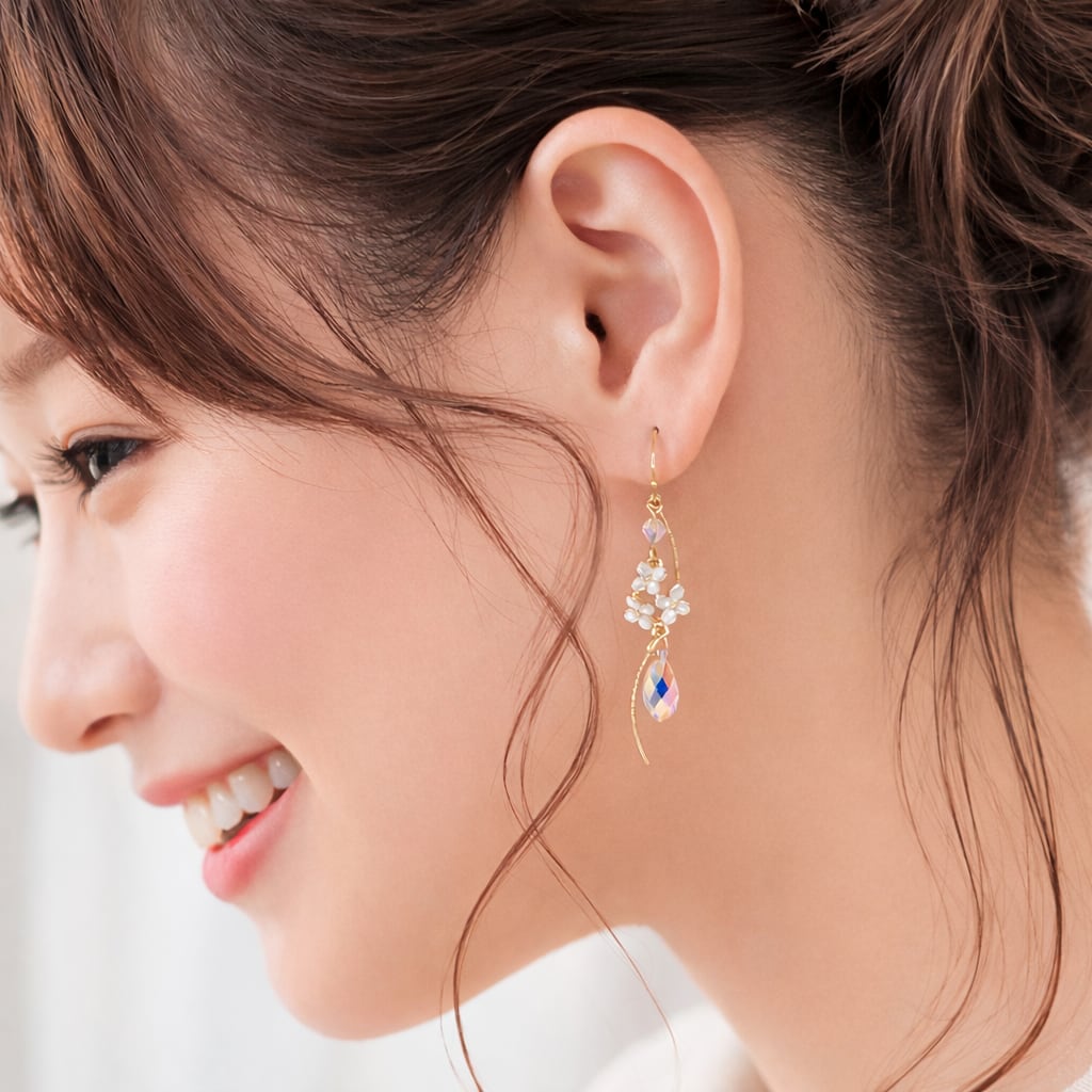 小ぶりの花モチーフは、淡いミルキーホワイトが優しく耳元を彩り、揺れるたびにきらめくオーロラ雫が、まるで朝露のような透明感を演出します。